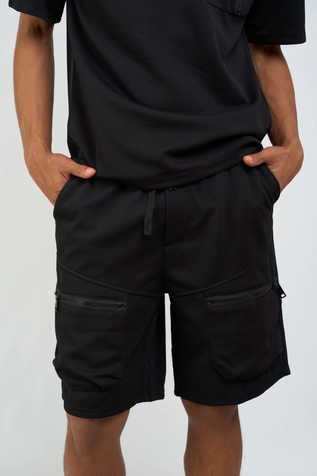 Conjunto confeccionado en tejido de panal respirable, ideal para días de calor y uso diario. La remera es básica y lleva bolsillo con cierre utilitario. El short incluye bolsillos funcionales con cierres, ajuste en la cintura y un calce relajado. Un set ideal: versátil, liviano y resistente, pensado para sumar estilo y practicidad en cualquier rutina.