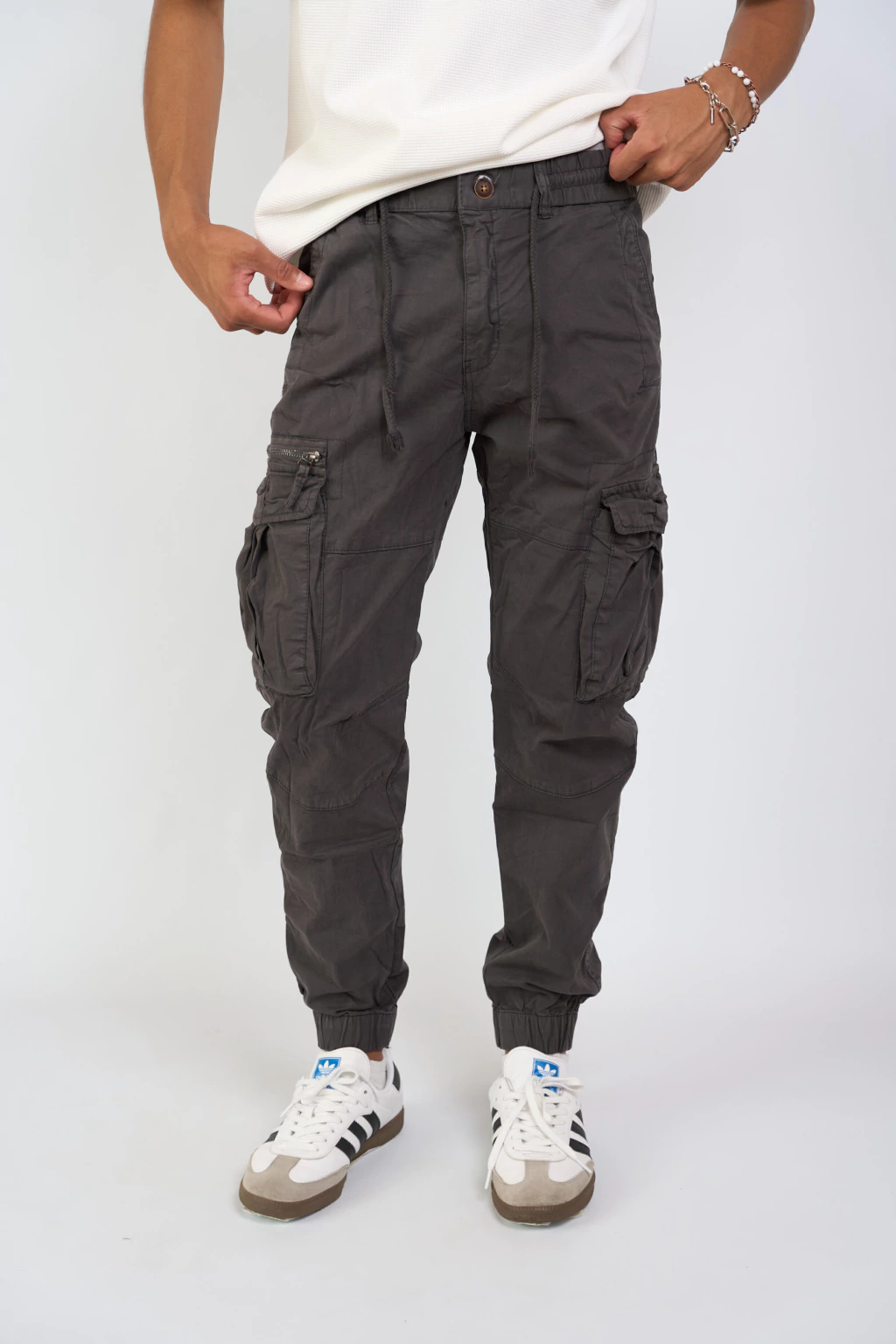 Pantalón relax fit confeccionado en gabardina de algodón con puño. Cuenta con bolsillos cargo y cierre en uno de los laterales. Con elástico en la cintura y cordones a tono con punta cosida. Una prenda versátil para usar todos los días, ideal para complementar un look canchero.