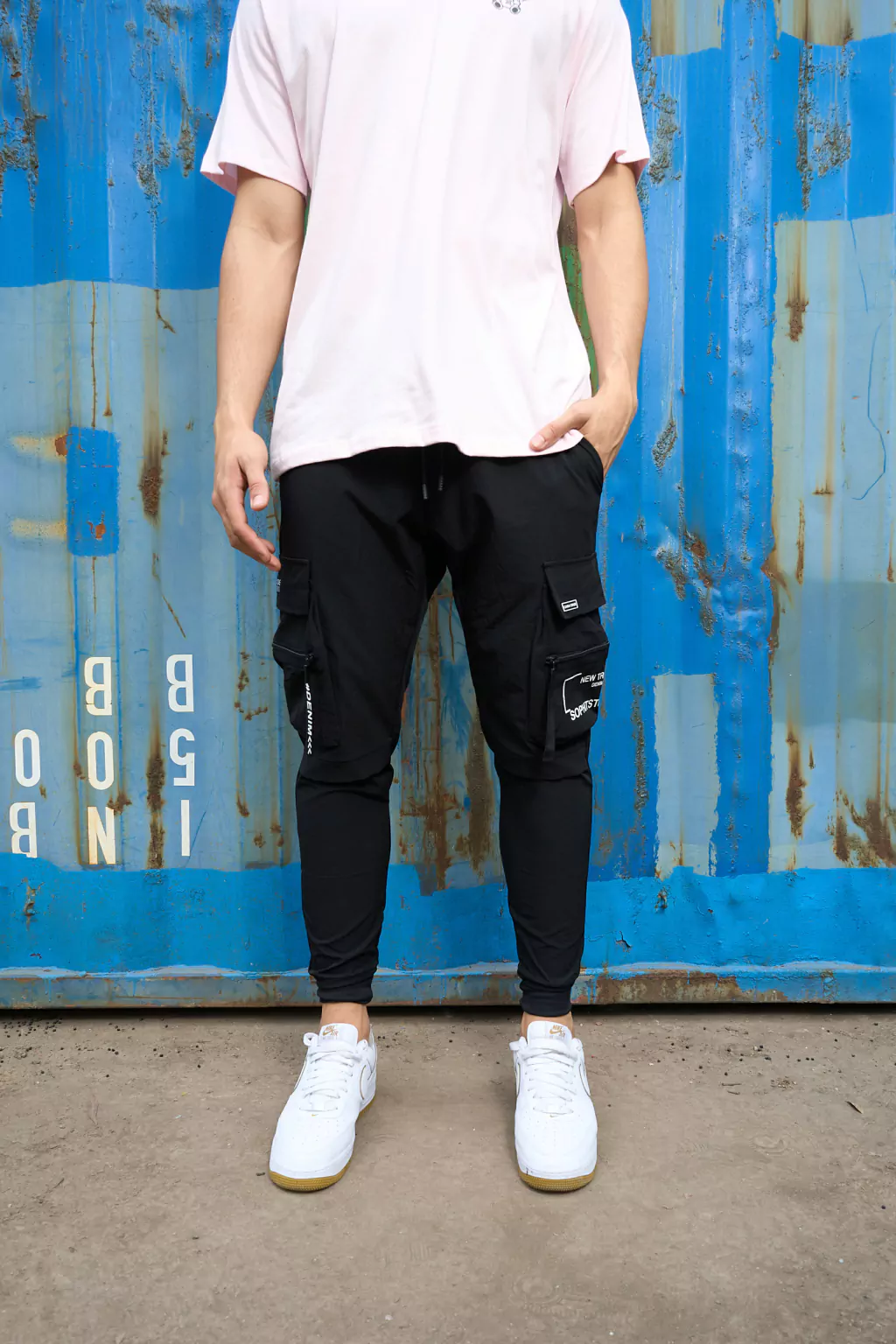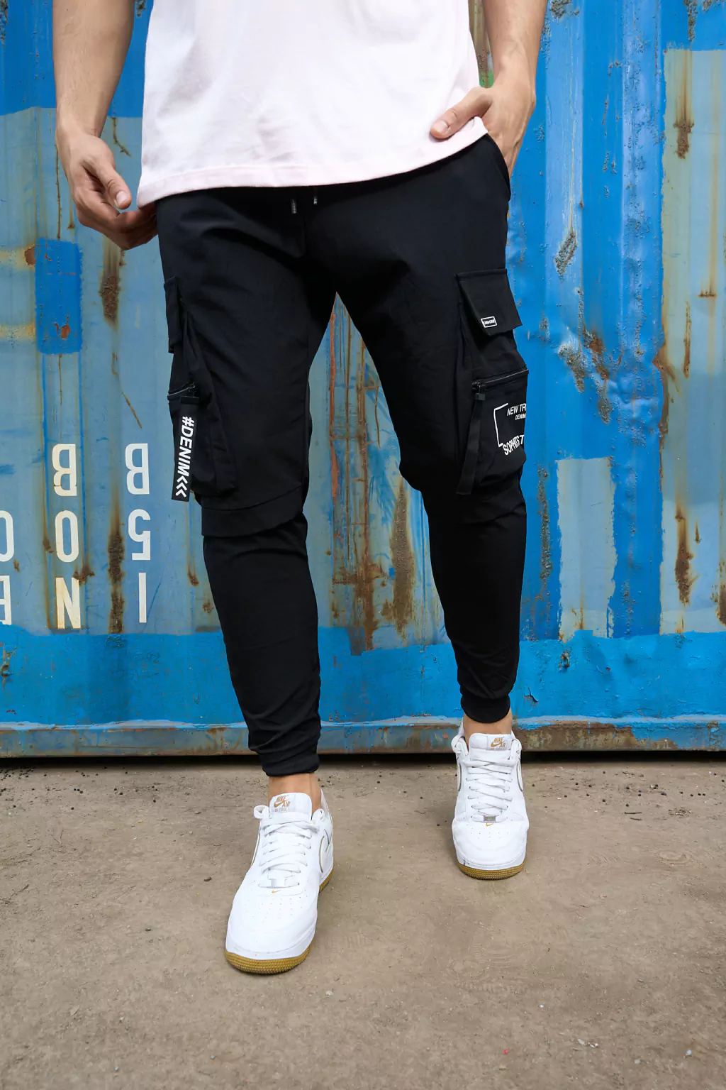 Pantalón cargo de calce clásico confeccionado en microfibra elastizada con puño. Cuenta con bolsillos laterales cargo con tapa y cierre. Tiracierres con estampa personalizados. Posee cintura elástica y cordones negros con punta metálica. Versátil para complementar un look canchero de todos los días o para la noche.