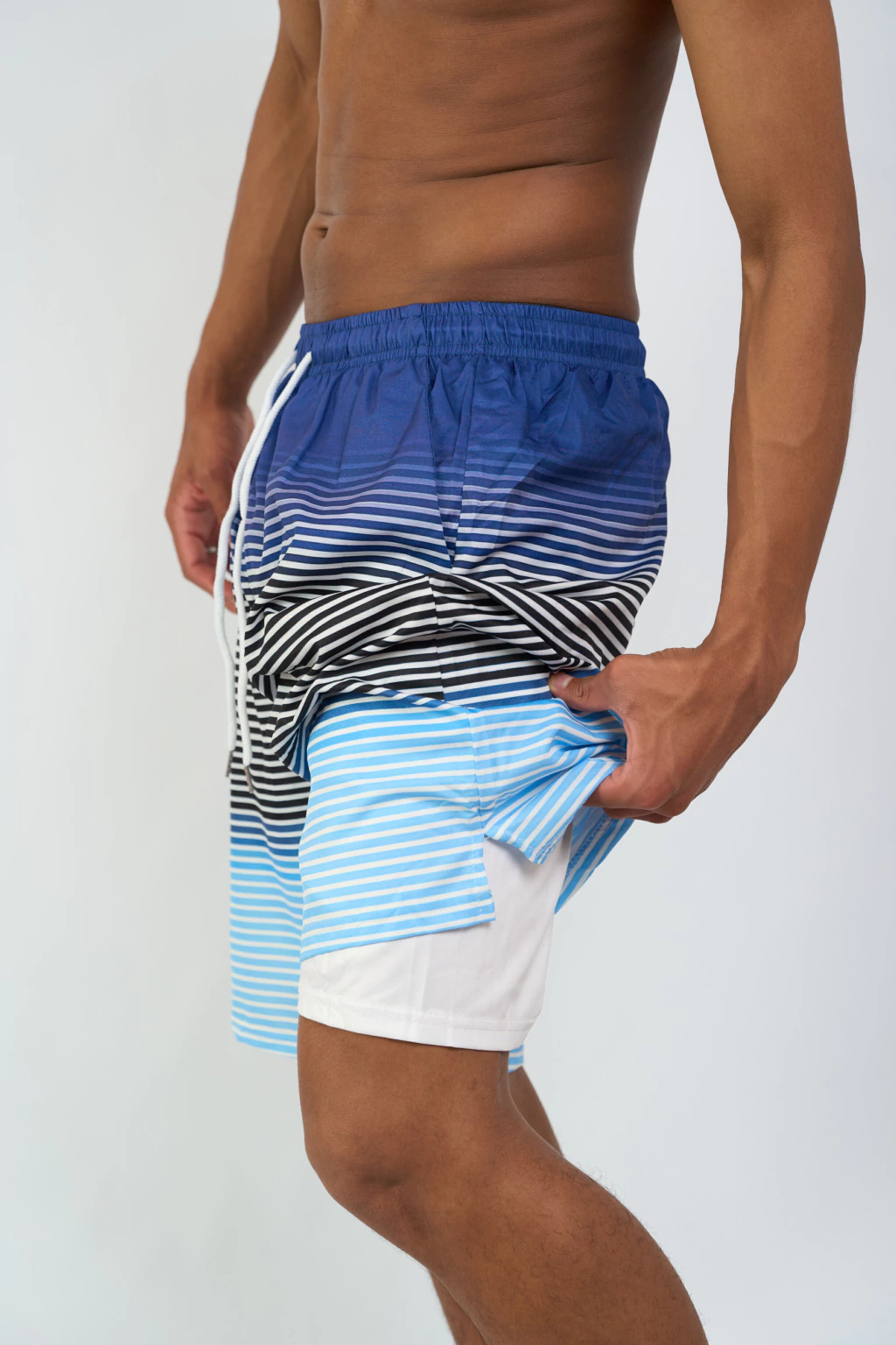 Short de baño con diseño rayado en tonos celestes y azules, confeccionado en tela liviana y de secado rápido. Con cintura elástica y cordón regulable para mejor ajuste. El interior incluye una calza elastizada lisa aportando comodidad. De corte clásico, cómodo e ideal para uso diario en playa o pileta.